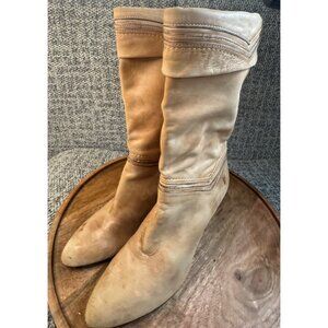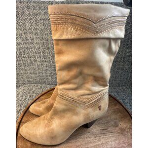 Frye Simone Cuff Mid-Calf Leather Natural Tan Boots With Stacked Heel.Size 8