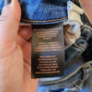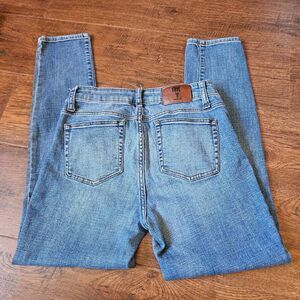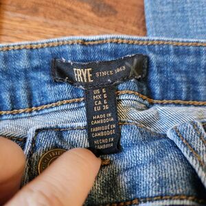 This is a pair of skinny jeans by Frye. They feature whiskering on the legs and a large leather brand patch on the back waistband.