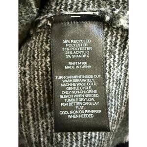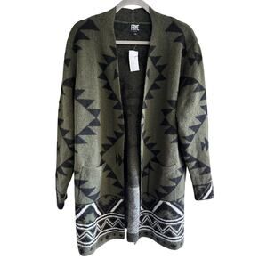 Cozy meets chic in this Frye open-front cardigan, crafted with a soft and sustainable blend of 36% recycled polyester, 33% polyester, 28% acrylic, and 3% spandex. Featuring a striking Aztec-inspired geometric pattern in black and olive with white accents, this longline sweater is perfect for layering over tees or turtlenecks. Designed with side pockets and a relaxed fit for effortless comfort. New with tags.