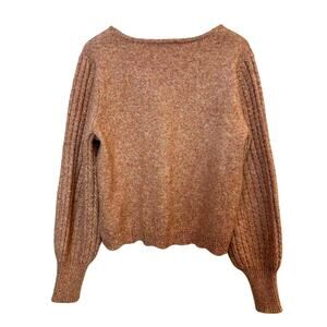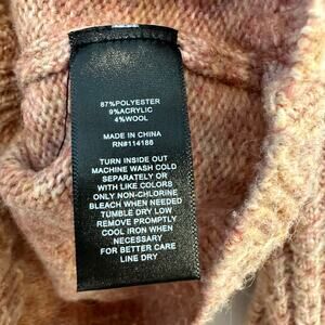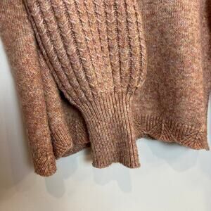 Frye Space Dye Sweater Balloon Sleeves V Neck Cropped Orange Pink Wool Blend. Space dyed knit with orange and pink tones. V neckline. Scalloped hem detail. Slightly boxy and cropped fit. Balloon sleeves with chunky knit detail. Pullover soft cozy sweater.