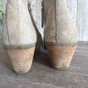 A light neutral tan suede boot. Pointed toe to have a more Western look. Ankle height that can still be worn under jeans. There is a small mark on the right toe and shown in photos. Size 6 run true to size