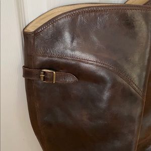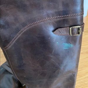 Tall soft brown detailed riding boots with pointed toe and added buckles. Made from a smooth vintage Italian leather and has a low heel.