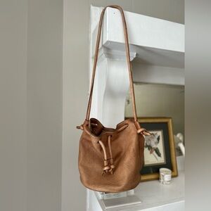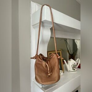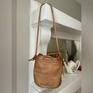 This stylish tan leather drawstring bag is perfect for any occasion. Its elegant design and versatile color make it a must-have accessory.