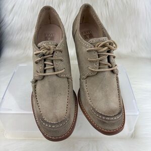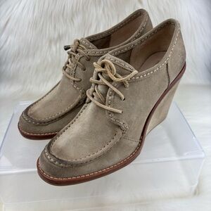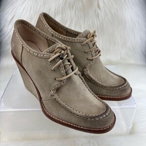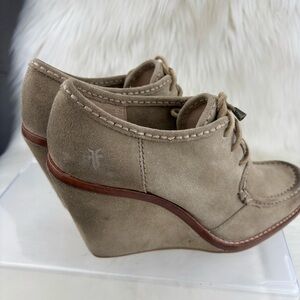 Frye wedge booties in tan offer a stylish moccasin-inspired design with a comfortable wedge heel. The lace-up closure and detailed stitching provide a casual yet elegant look, perfect for any occasion.