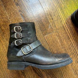 Frye Veronica Belted Buckle Shortie Moto Boot in Distressed Black/Brown