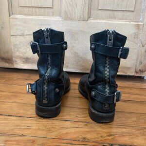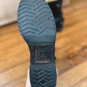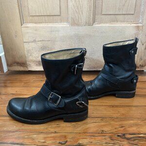 Black leather Frye Veronica ankle boots. Boots have two straps and buckles and zipper up the back. Left boot is missing bottom strap. In good condition.