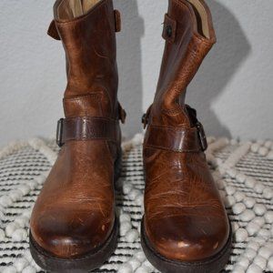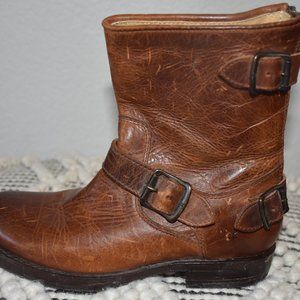 Frye Veronica Boots Distressed Cognac Zip Back Buckles Size 6. Condition is Pre-owned. Not really any wear, great condition, only wore a few times. Heel is 1", platform is 1/2 inch. Please message with any questions.