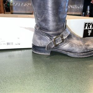 Distressed grayish black slouch boot they are beautiful mid-calf boot that don’t get enough love as they deserve! Super comfy but I just don’t wear them enough.