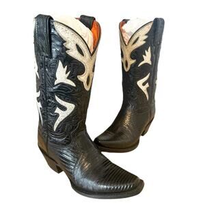 RARE! True vintage... Frye's are not made of this quality anymore and getting harder and harder to find in this condition. These are the lily part lizard leather with epic crackled muted white f logo detailing against whimsical black leather inlay pattern - so beautiful! Vamps are in perfect shape with high shine leather... very minimal signs of wear on leather outsole. Amazing craftsmanship made in Mexico with yellowish orange leather interior ( shoes some "age wear". These made a true statement, where with a tight black dress, jeans shorts, overalls etc they're gorgeous!
