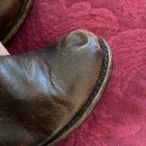 Vintage Frye Tall Pull-on leather boots, double buckle, dark brown. Unsure of definite age.
