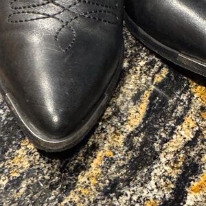 Very comfortable with perfect instep western boities. These are rich black with stitching details on the top leather. Toe moldings added to protect tips. There is a water stain in one boot by elastic strap from spilled water which has not damaged leather.