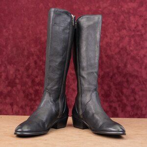Crafted from premium black leather, this tall boot features subtle Western-inspired piping and a comfortable stacked heel. Quality construction built to last a lifetime.
