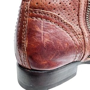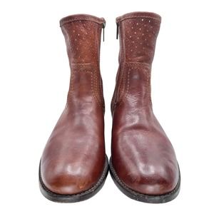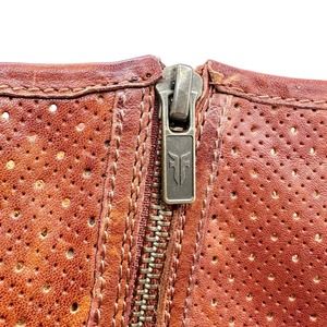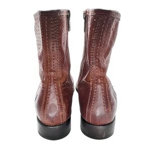 Pre-owned women’s Frye Melissa whiskey perforated leather ankle zip up booties with an almond toe.
