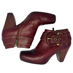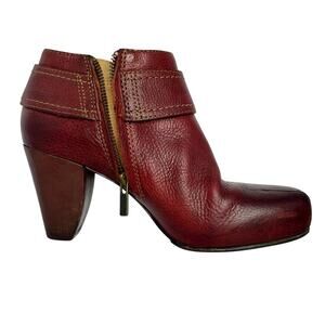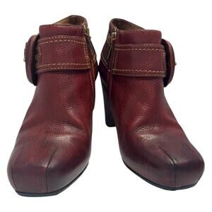Frye Women's Andie Red Leather High Heeled Big Buckle Side Zip Bootie - Size 6. In good preowned condition - some signs of wear, but lots of life left. No stains or flaws. MSRP $275.