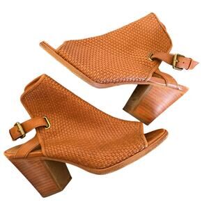 Frye Women's Brown Leather Woven Shield Peep Toe Slingback Heel - Size 10. In excellent preowned condition, except for some scuffs on the back of the right heel - shown in photos. MSRP $328.