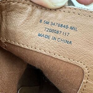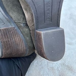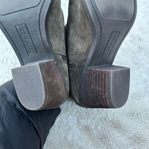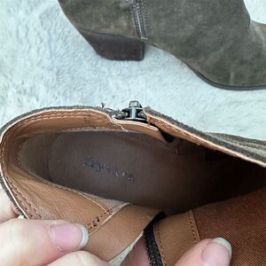 Keywords: Frye, bootie, women's footwear, suede leather, brown boots, casual wear, ankle boots, fall fashion, side zip, block heel, round toe, pre-owned, size 8.5, medium width, China.