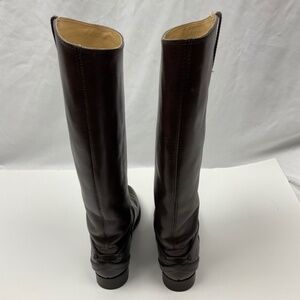 In dark brown smooth grain leather; style 76976. Belted. Knee-high riding boot featuring slender ankle strap and antiqued logo plaque at heel. Asymmetric topline with single pull strap. In very good used condition!