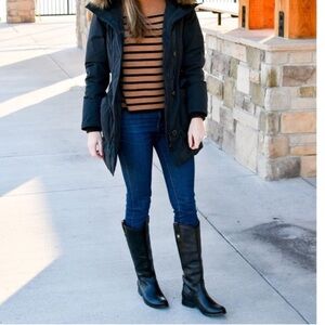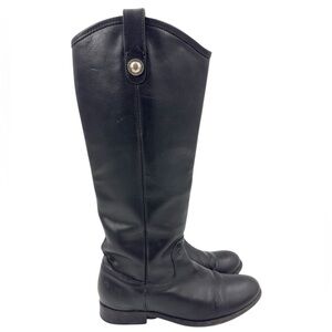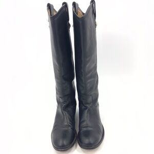 The Frye tall Melissa boots are a classic! These beautiful pull on equestrian-style boots are crafted from antiqued leather, detailed with signature hardware, and low black heel.