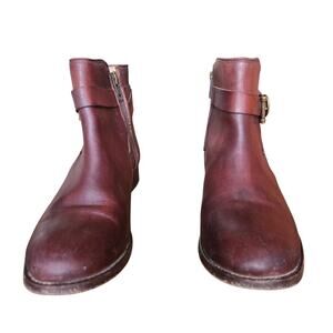 frye boots women, leather ankle boots, frye strap boots, made in mexico boots, brown frye boots, size 3.5 boots, buckle zip boots, round toe boots, casual leather boots, classic frye footwear, small size boots, western inspired boots