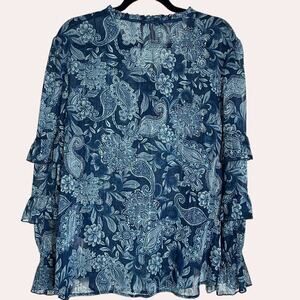 Frye and Co Floral Print Ruffle Sheer Metallic Thread Boho Pheasant Blouse (XL)
