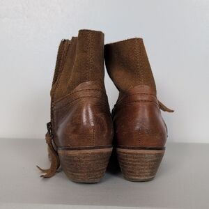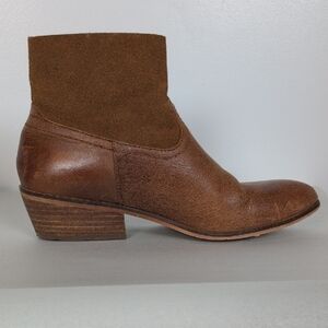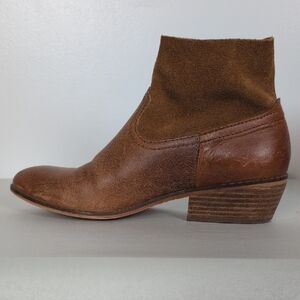 Brown leather. Almond toe. Side zip. There are some scratch marks on the toe of the left boot and some light distressing/scuffing. All distressing is cosmetic, the shoes are still in great shape. Please see photos for details of condition.