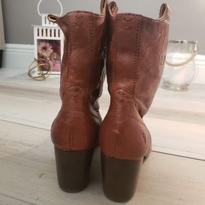 Leather. Block heel <4. comfortable booties. awesome length. Can wear many ways girl!