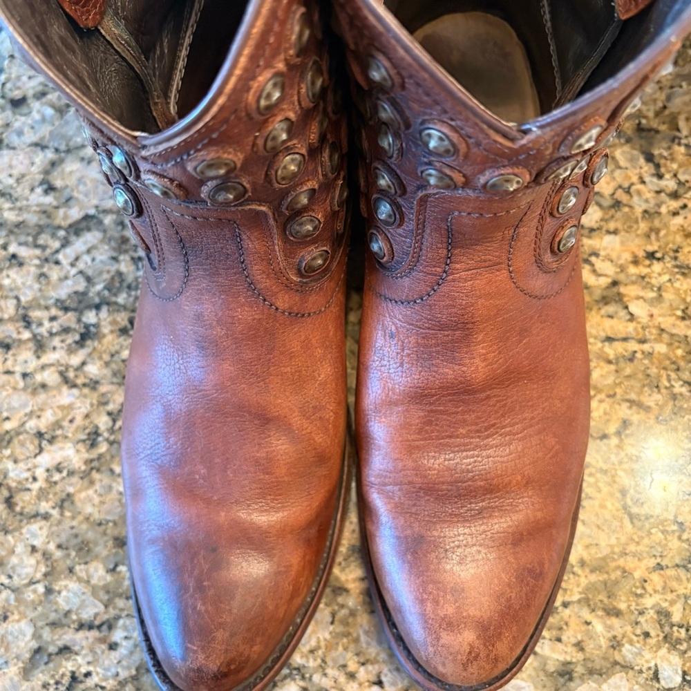 Frye Wyatt studded western boots. These are a size 8 and the color brown. They are leather with hammered metal stud accents. Some minor wear on soles.