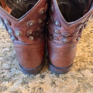 Frye Wyatt studded western boots. These are a size 8 and the color brown. They are leather with hammered metal stud accents. Overall good condition.
