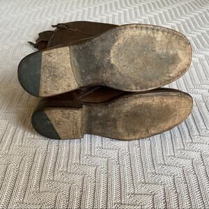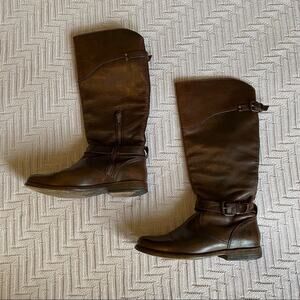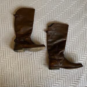 Frye brown leather flat boots, size 7. Side quarter zipper to help with pull on. Boots come up to just below the knee. Distressed leather, rounded toe, slight stacked heel. Previously loved but in excellent used condition. Non-smoking and pet free house.