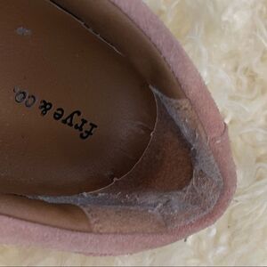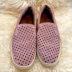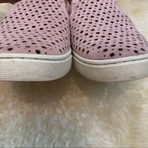 Comfortable and cute perforated blush pink slip on shoes from Frye & co. Soft suede upper, rubber soles and an elastic band around opening for easy on and off. Outside shows light signs of wear, surface dirt inside heel area has some more noticeable wear from taking on and off. Still a great looking, comfortable and functional shoe.