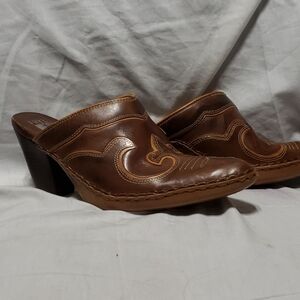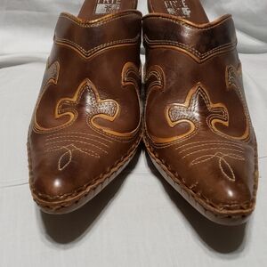 Frye heeled slide ons brown orange tooled cute