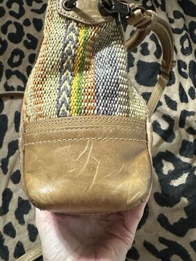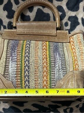 Stylish woven shoulder bag with multicolor striped fabric and tan leather trim. Lightweight and easy to carry for everyday use. Features a secure top handle and adjustable strap. The tan leather accents complement the vibrant woven stripes.