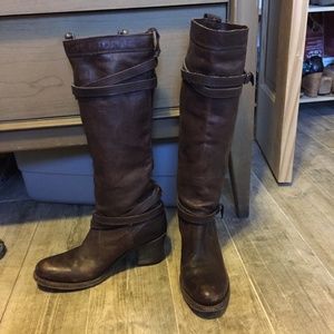 These Frye Jane Strappy boots size 8 are used but good condition. They have some scuffs on the leather which I've shown in the pictures. They are extremely well made and will last years if taken care of.