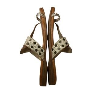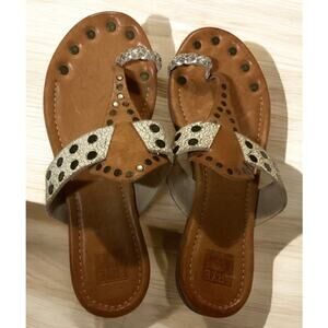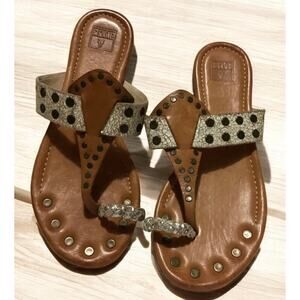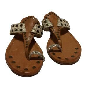 Frye tan leather sandals brass studs on the toe post. Size 8