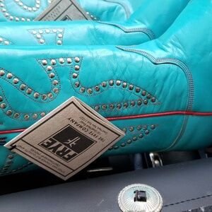 Frye "Daisy Dukes" beautifully hand crafted in the USA. Gorgeous Turquoise with red piping and silver studs .nice red stitch toe medallion and red side pulls to accent the turquoise leather. full leather sole and leather lined.2 pair only!! sizes 7.5 and 8.5..won't last.***sorry Im not negotiable on these unique new boots.I have reduced them already and Poshmark takes 20%. of that..You can probably find used ones at a lower price.