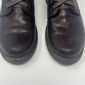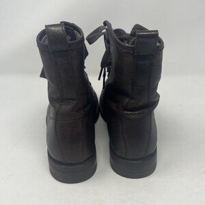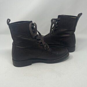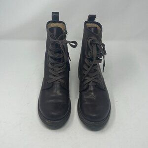 Frye women's combat boots, size 8. Dark brown leather with tonal laces. Pull on tab on back of heel. Appears similar to the current Veronica Combat style. Style number 3476276. Round toe. Gently worn, in excellent used condition. Minor signs of wear, see photos.