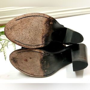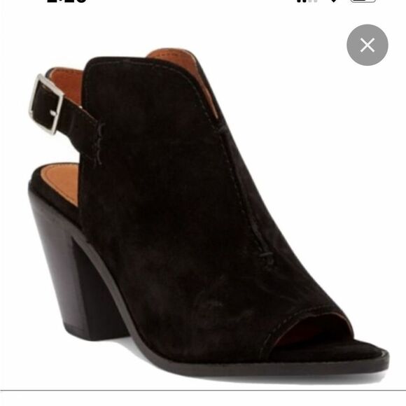 Used in excellent condition Frye Courtney black suede Slingback heels. Ankle strap closure and peep toe. See photos for measurements and light wear.
