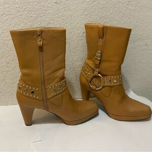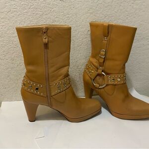Frye Leather Katie Ring Platform Studded Tan Heeled Boots, 7.5M