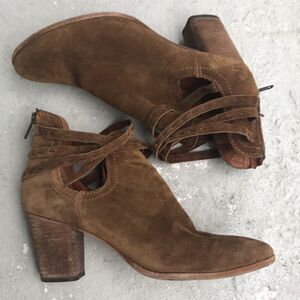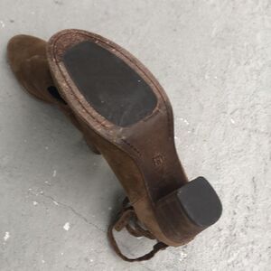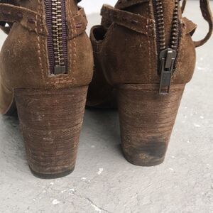 Light brown suede that are in good condition but please look at the pictures as the back of the right he’ll need to clean up or you could just start them both. Wood block heel. Heel height is almost 3 inches
