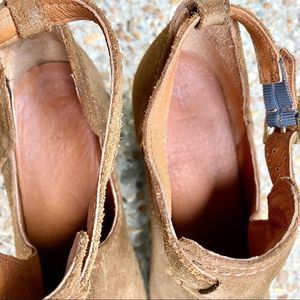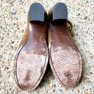 Fry Meghan chestnut suede booties shooties with adjustable ankle buckle enclosure and leather sole