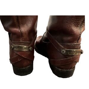 Distressed rich brown riding boots on GUC. One inch heel, Frye logo on the outer corner and “The Frye Company” on metal plate on the back of boot.