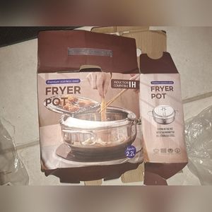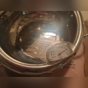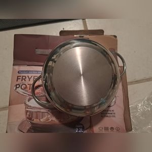 Premium stainless steel fryer pot with thermometer, new never used! However, the box is beat up some but pot brand new.