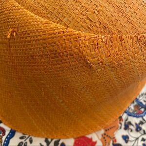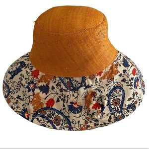 Super unique! Fsall Selection Raffia Sun Hat in a fun orange hue & paisley print. This hat was handmade by textile artist Fatou Salk in the USA. It is composed of 100% woven raffia with a fabric printed paisley brim & adorned with a bow. Not only is it adorable but it protects from harmful UV rays. In very good preloved condition with minimal normal wear including spots shown in the photo where the raffia has uneven texture. Common for raffia & does not impact wear. One size. Bundle to maximize shipping!