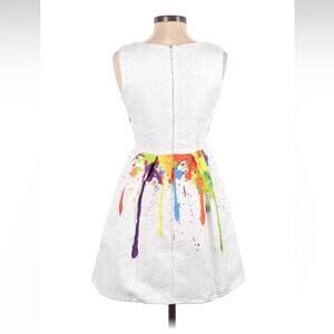 Striking white jacquard fit and flare mini dress with multi colored splatter paint design at waist. Dress is fully lined with nice weight and texture to fabric, back zip closure, not much for stretch, and no pockets. Asian sizing runs small, please double check measurements!