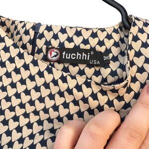Fuchhi dress in size medium. VGUC, navy and tan with heart design and tie in the back. 29” from top to bottom. Fits like a size small. Pet friendly home.