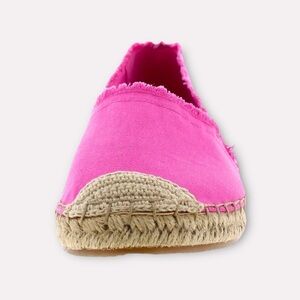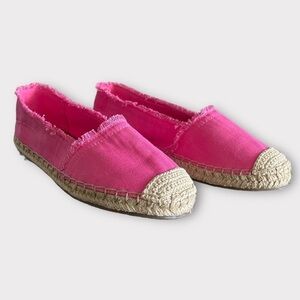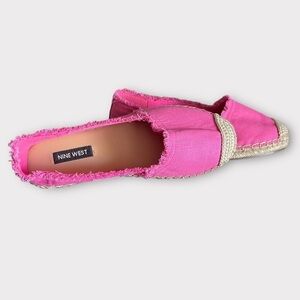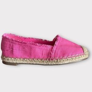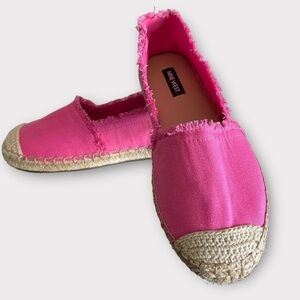 Bright pink espadrille flats by Nine West in canvas with woven jute sole and frayed trim. Slip-on style, brand new without box. Fun pop of color for vacation, summer, beachwear, or resort looks.