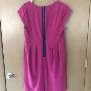 Cap sleeves, v-neck, blue contrast zipper,, and pin-tucked waist.