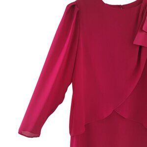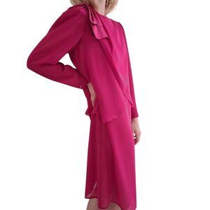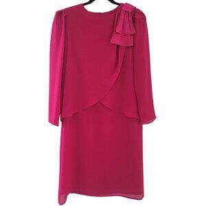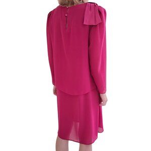 Fuchsia Hot Pink 80s Vintage Longsleeve Sheer Knee-Length Dress with Bow medium