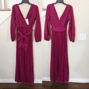 - Labeled size Small but fits like a Size 4 - Approx measurements lying flat: -Bust (armpit to armpit): 17" - Waist (Smallest part of the waist) : 13 1/4" - Length 60 1/4" - Pleated V- neckline - Long sleeves - A-line pleated skirt - Detachable belt