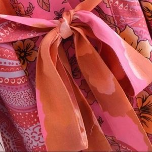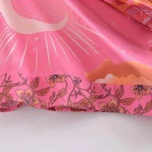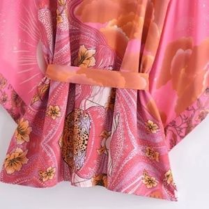 Gorgeous bright fuchsia pink multi colored floral cosmic bohemian galaxy printed short kimono robe with vented sleeves.